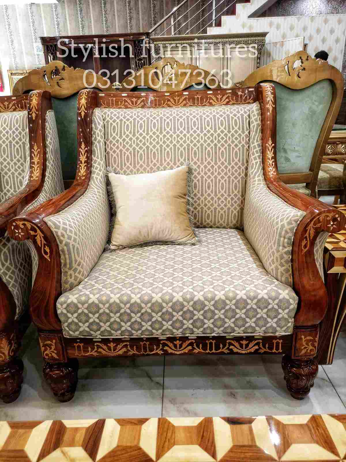 Every curve, carving, and inlay detail is a reflection of skilled Pakistani craftsmanship. Whether you’re searching for a modern sofa set, a sofa chair for your office, or a classic sofa set design for your living room, this piece brings timeless beauty to any interior space.